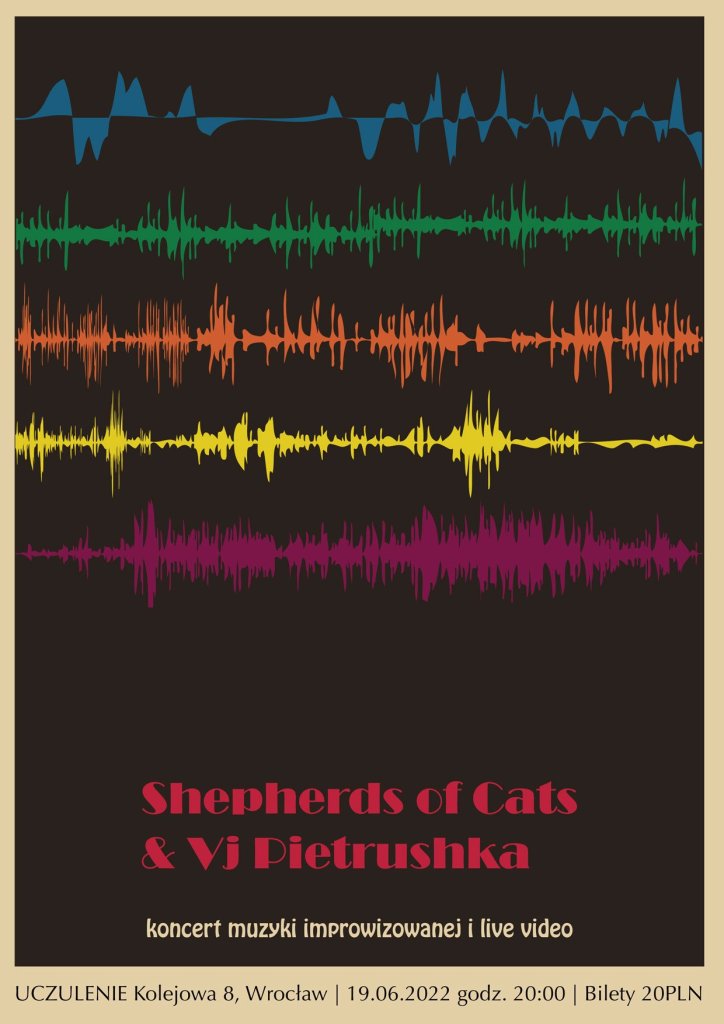 “Music is in spaces between sounds so paradoxically music is where there is no music. I can see sounds in colours, hence music is always connected with colours to me. Vj Pietrushka fills perfectly those spaces with his live video editing. It is like hanging baubles in different coloured shapes on Christmas tree that we have just brought from the wood. Shepherds of Cats concerts are audiovisual spectacles where sounds and moving images generated by Vj Pietrushka and are integral part of the band performance.” Jan Fanfare
